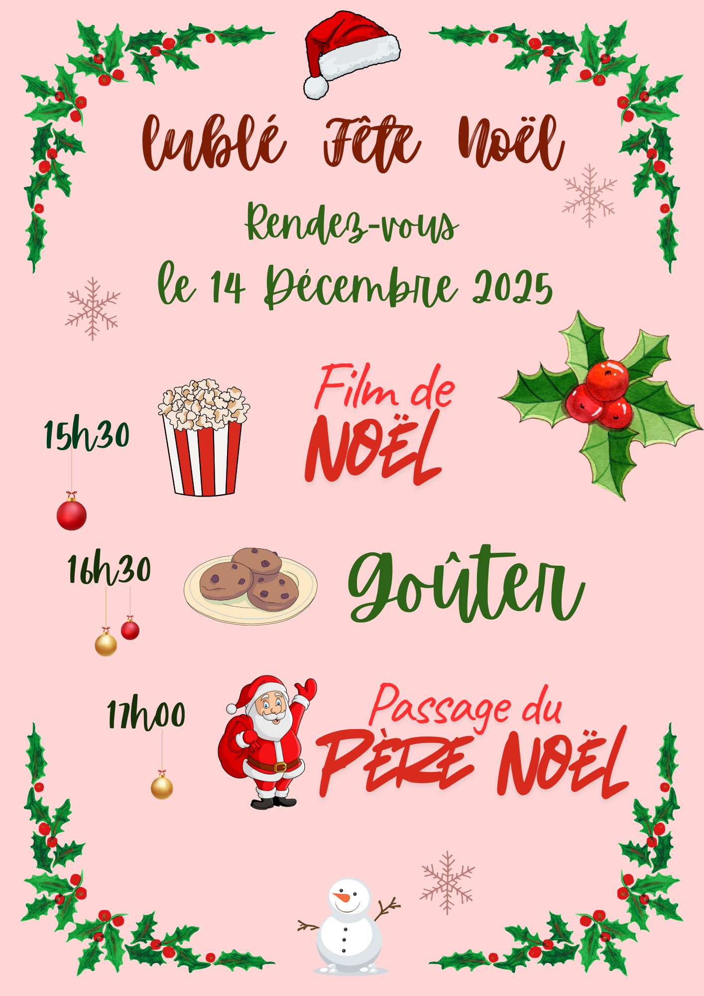 Accueil > Loisirs > Lublé fête Noël Loisirs retour Lublé fête Noël Lublé fête noël ! Au programme 15h30 FILM DE NOËL 16h30 GOÛTER DE NOËL 17h00 PASSAGE DU PÈRE NOËL